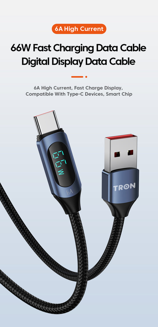 USB A to C Braided Charger Cable - Black, 6FT, with LED Light-TR6