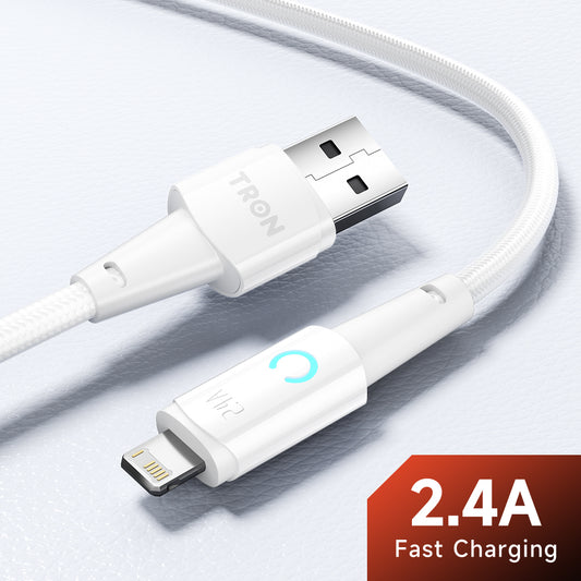 USB A to Lightning Braided Charger Cable - White, 6FT, with LED Light-TR9
