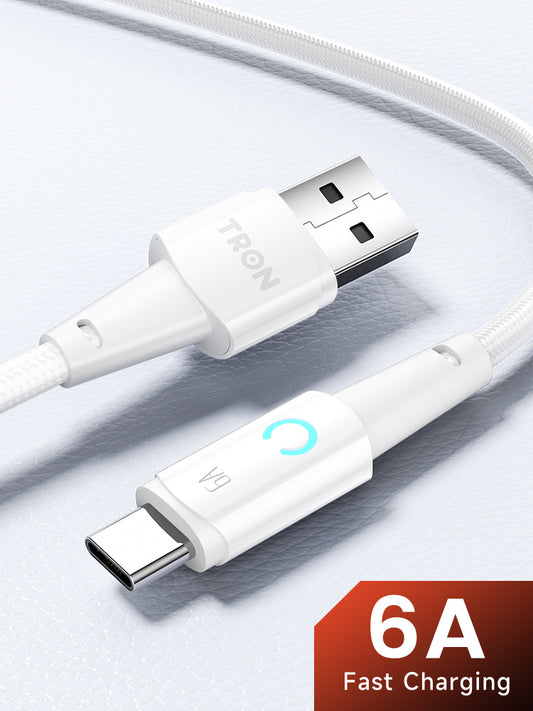 USB A to C Braided Charger Cable - White, 6FT, with LED Light-TR7