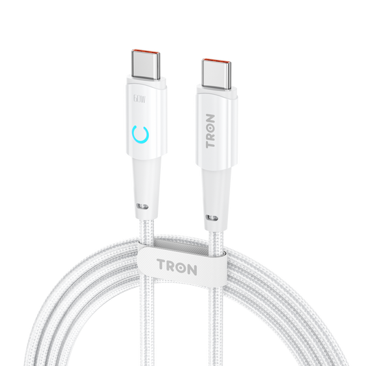 USB C to C Braided Charger Cable - White, 6FT, with LED Light-TR11