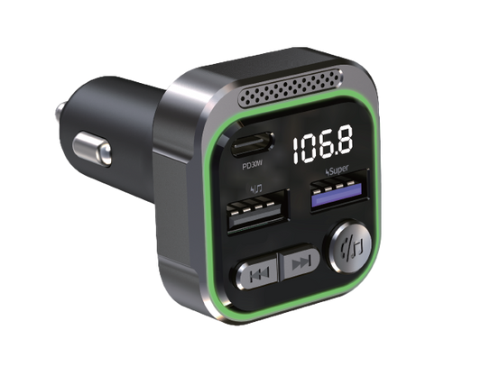 30W Car Bluetooth FM Transmitter & Power Adapter, 3-Port USB-A + USB-A + USB-C with LED Light-TR43