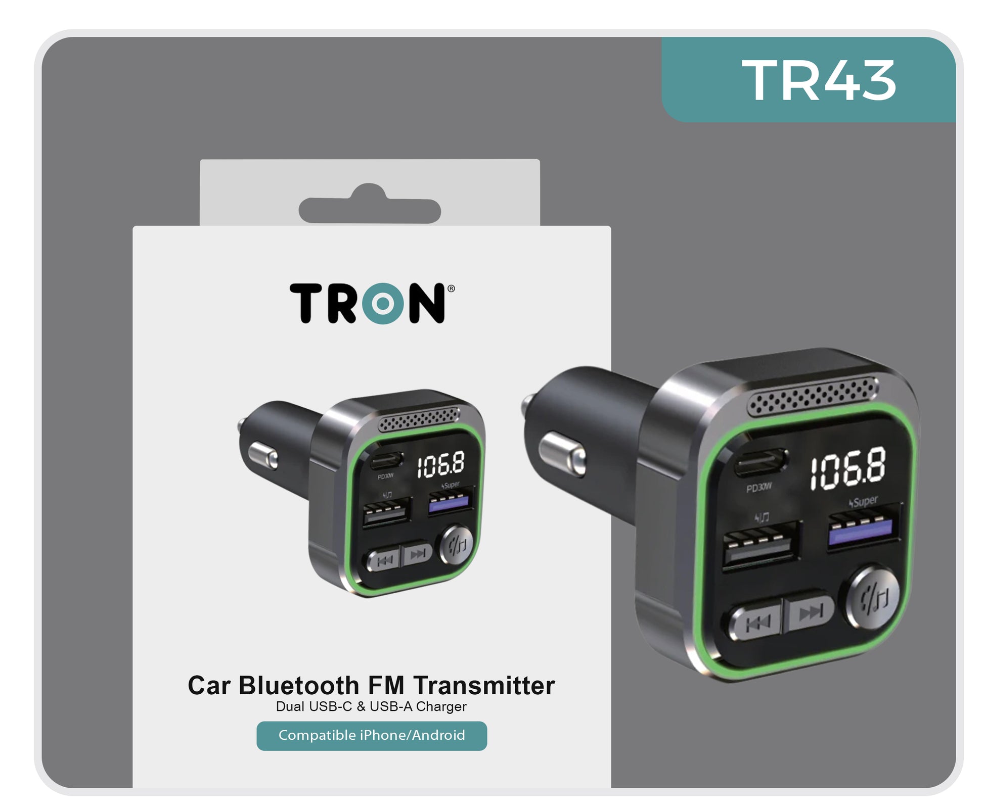 30W Car Bluetooth FM Transmitter & Power Adapter, 3-Port USB-A + USB-A + USB-C with LED Light-TR43