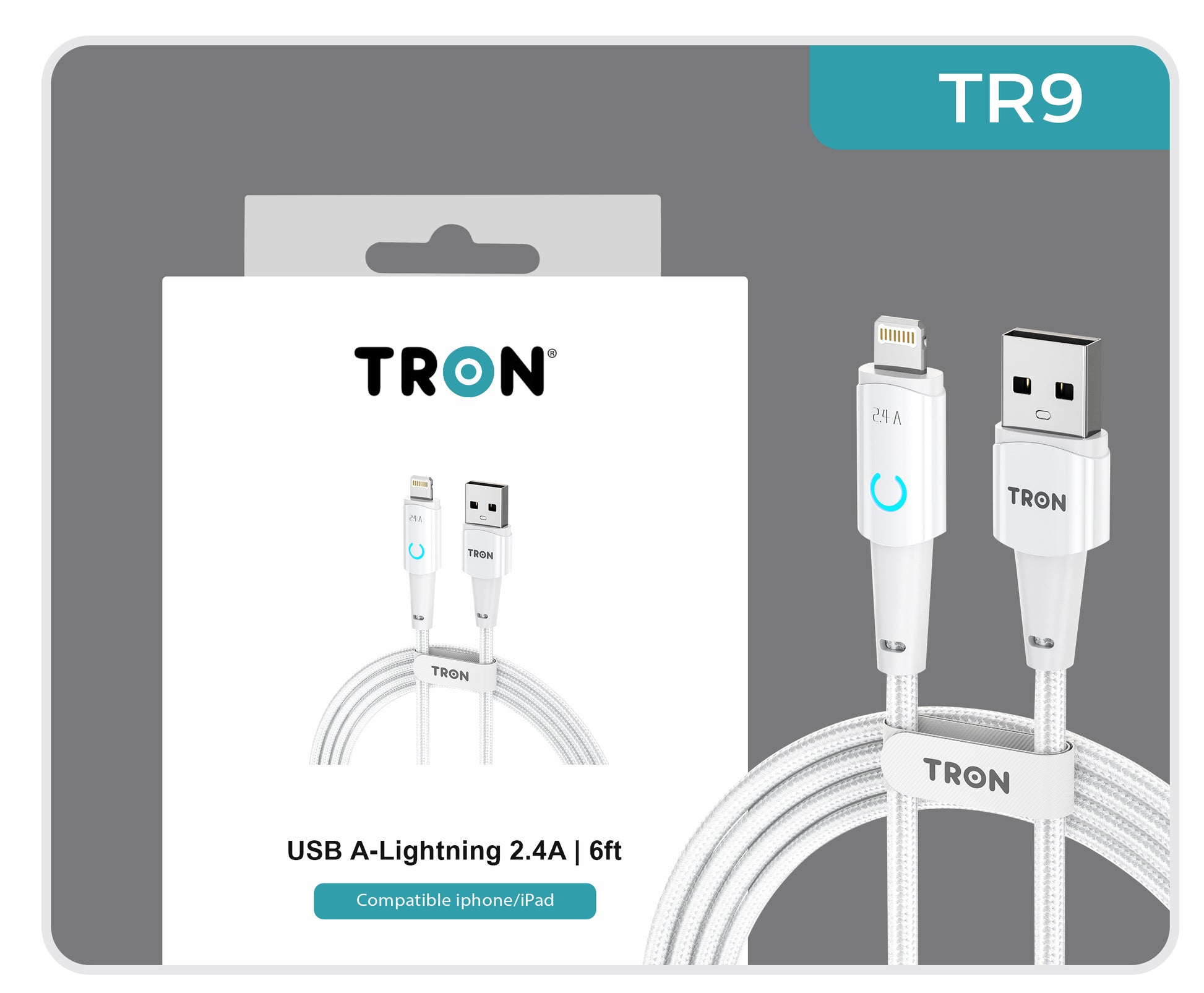 USB A to Lightning Braided Charger Cable - White, 6FT, with LED Light-TR9